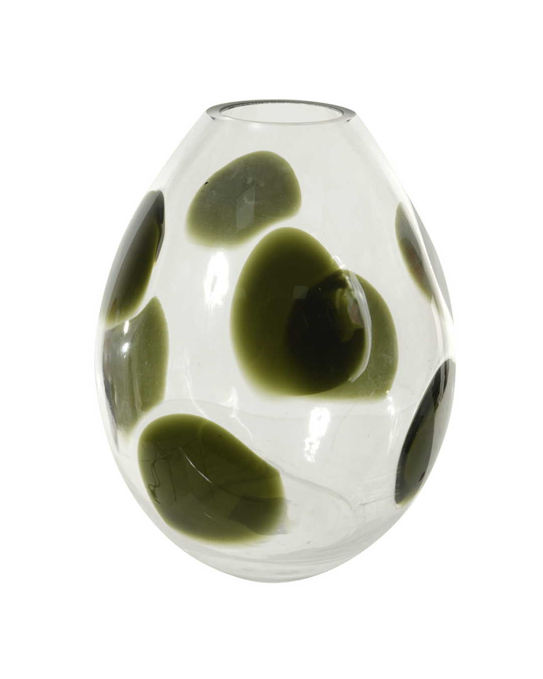 Impressionante e artístico, este vaso de vidro combina o brilho translúcido com manchas orgânicas em verde profundo, criando um visual sofisticado e cheio de personalidade. Sua forma arredondada e acabamento artesanal fazem dele um verdadeiro destaque na decoração.