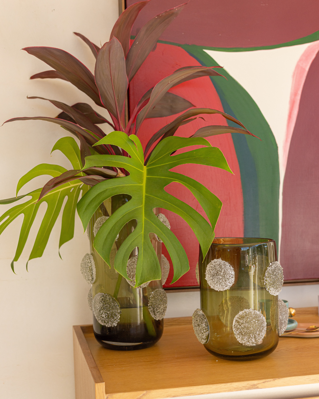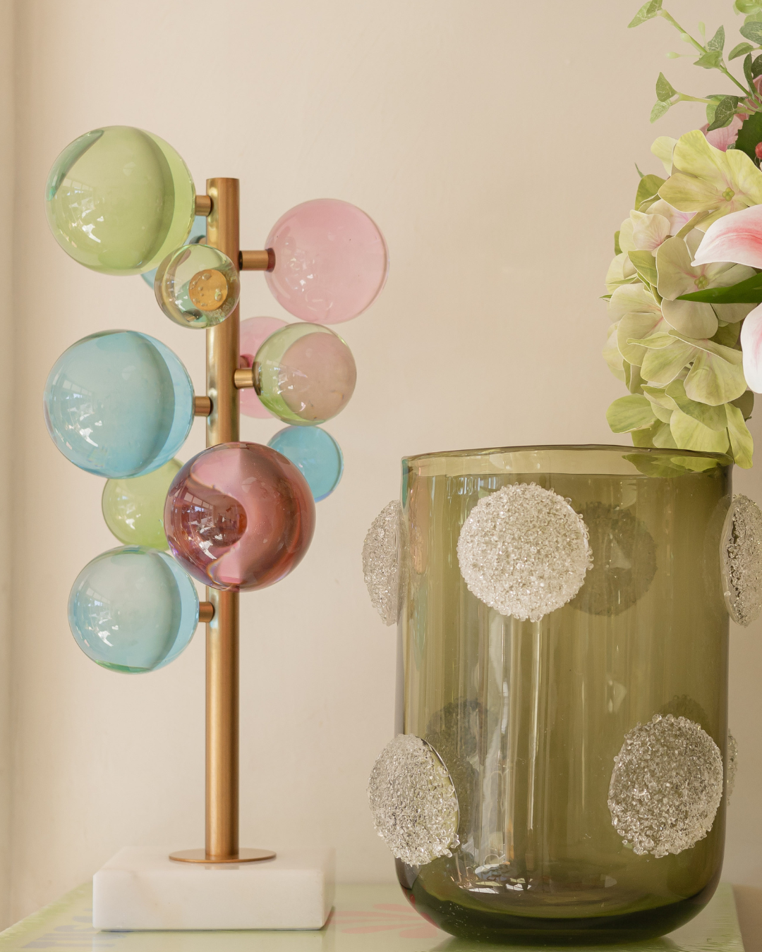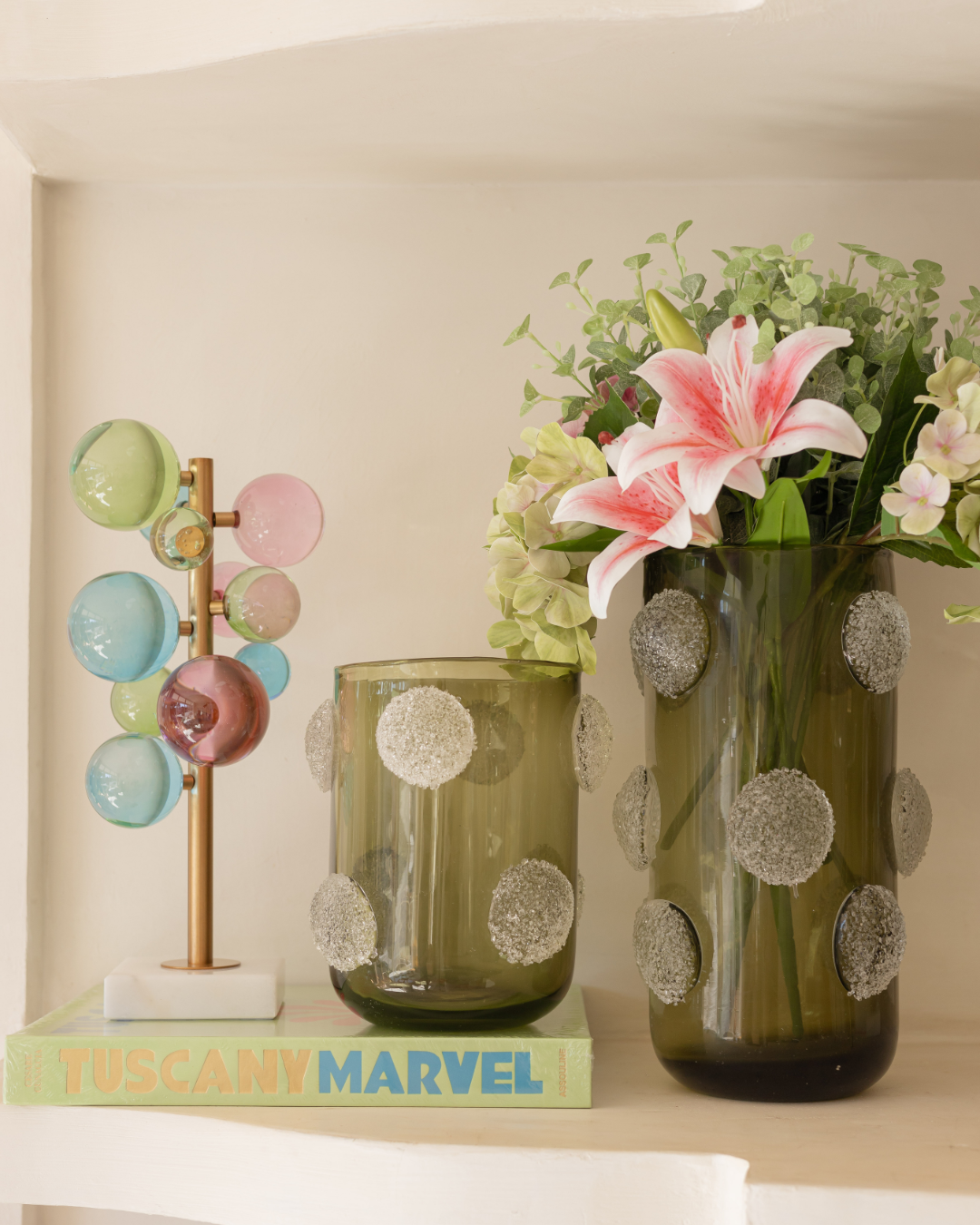 Vaso de Vidro Limoné é uma peça única que combina elegância e originalidade. Com um design contemporâneo, ele apresenta uma estrutura em vidro verde-limão translúcido, realçada por detalhes em relevo conhecidos como "cataporas". Essas aplicações circulares, transparentes e texturizadas, criam um efeito visual intrigante e sofisticado, oferecendo dinamismo à superfície lisa do vaso.
