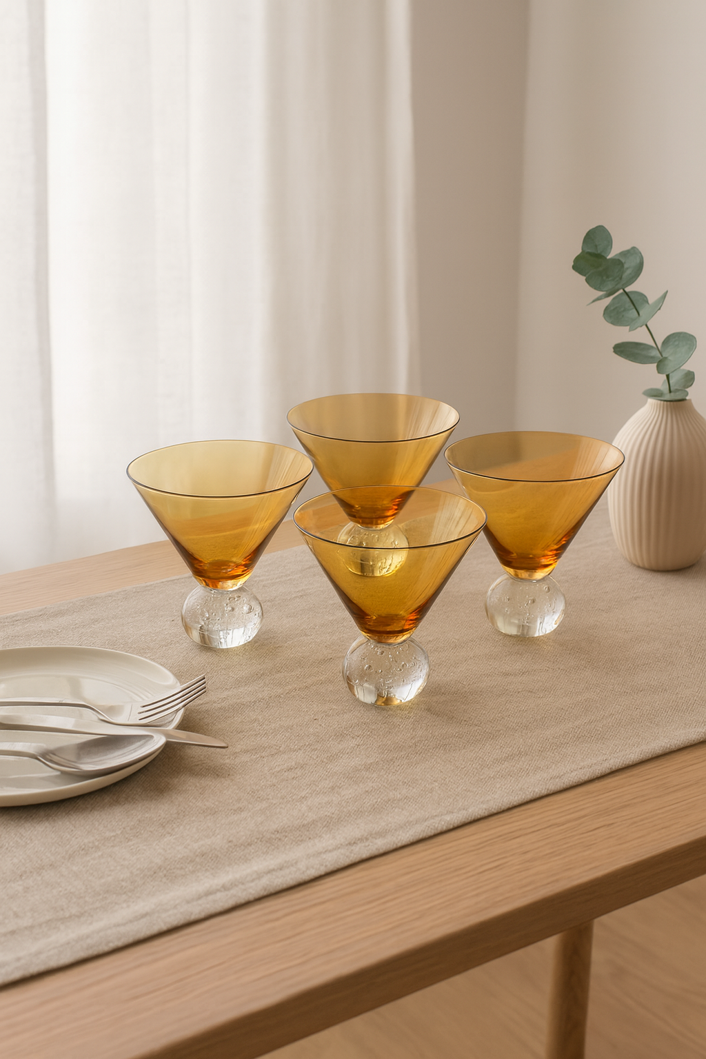 O Conjunto de Taças Vibrance Bubbles traz uma estética contemporânea que encanta à primeira vista: a taça em vidro âmbar possui um tom quente e sofisticado, enquanto a base em formato de esfera transparente com bolhas internas cria um efeito visual único, leve e extremamente elegante.