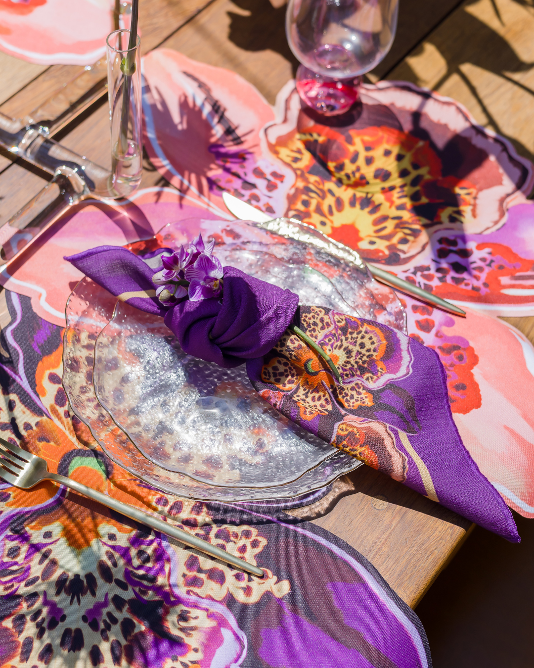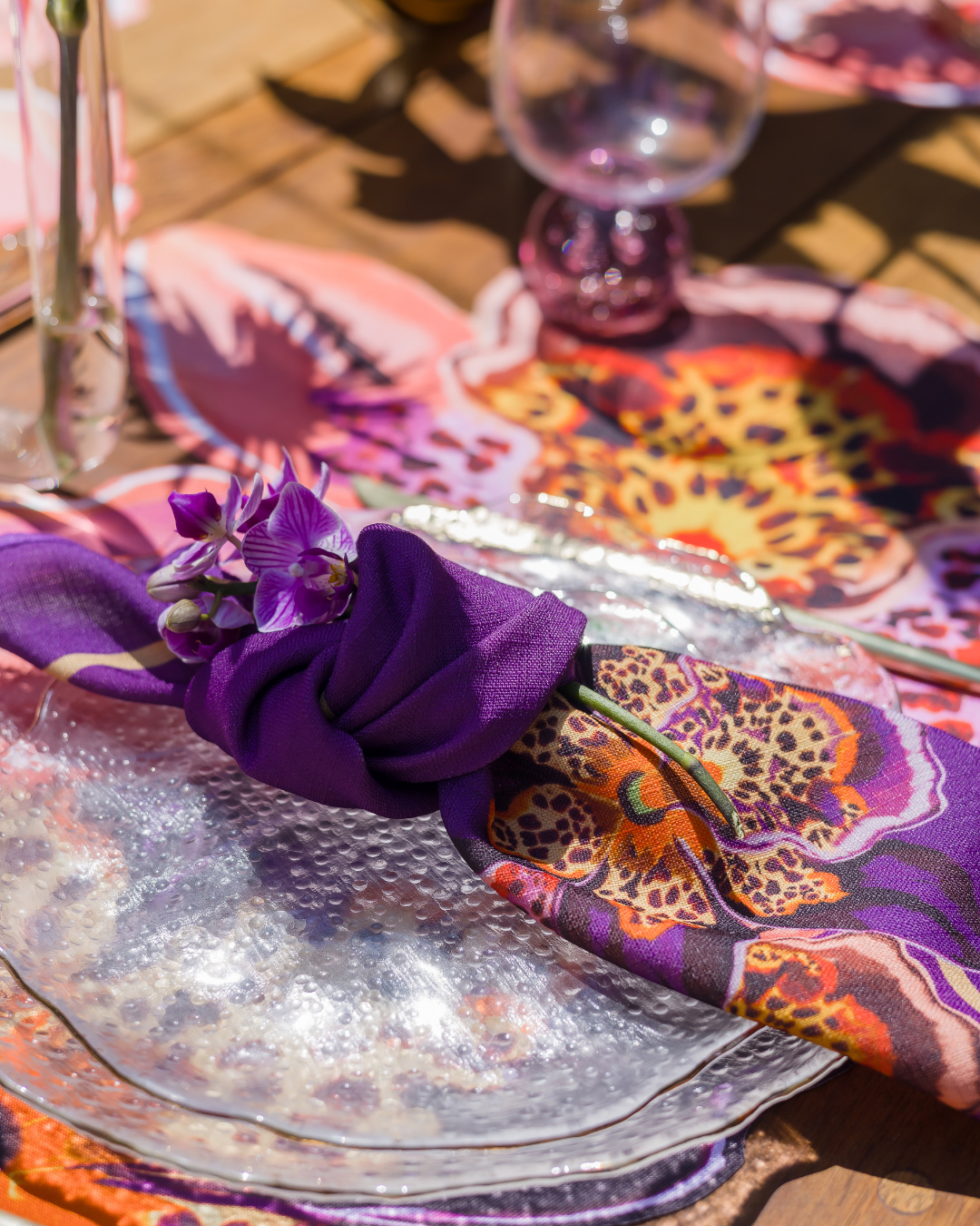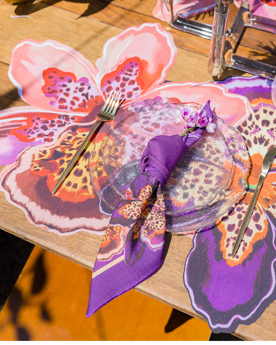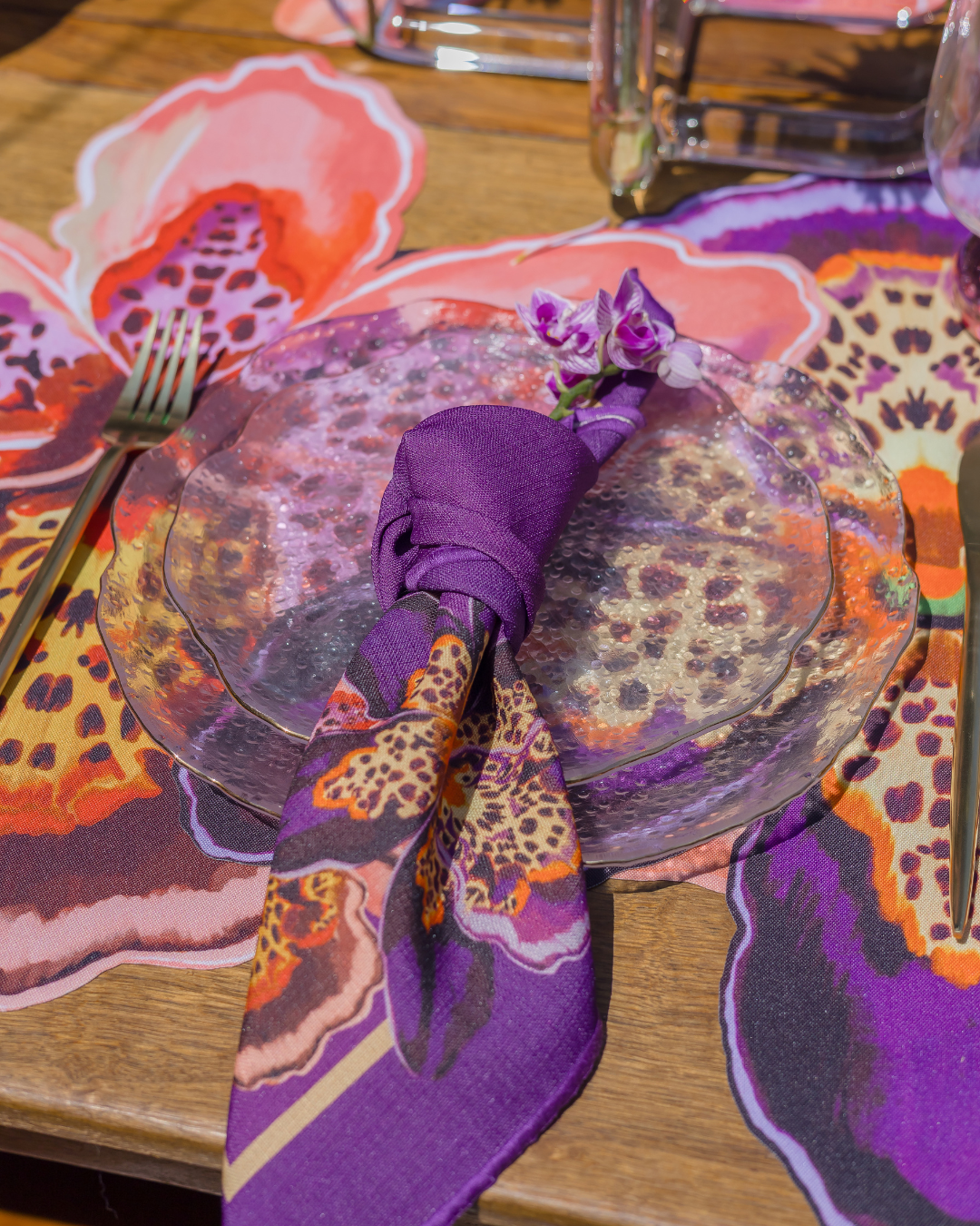 O Conjunto de Guardanapos Bloom - Orquídea Roxa leva a delicadeza e a exuberância das flores tropicais para a sua mesa posta. Com estampa exclusiva inspirada na orquídea roxa, cada peça traz cores intensas e sofisticadas que valorizam qualquer ocasião, desde um almoço descontraído até um jantar especial.