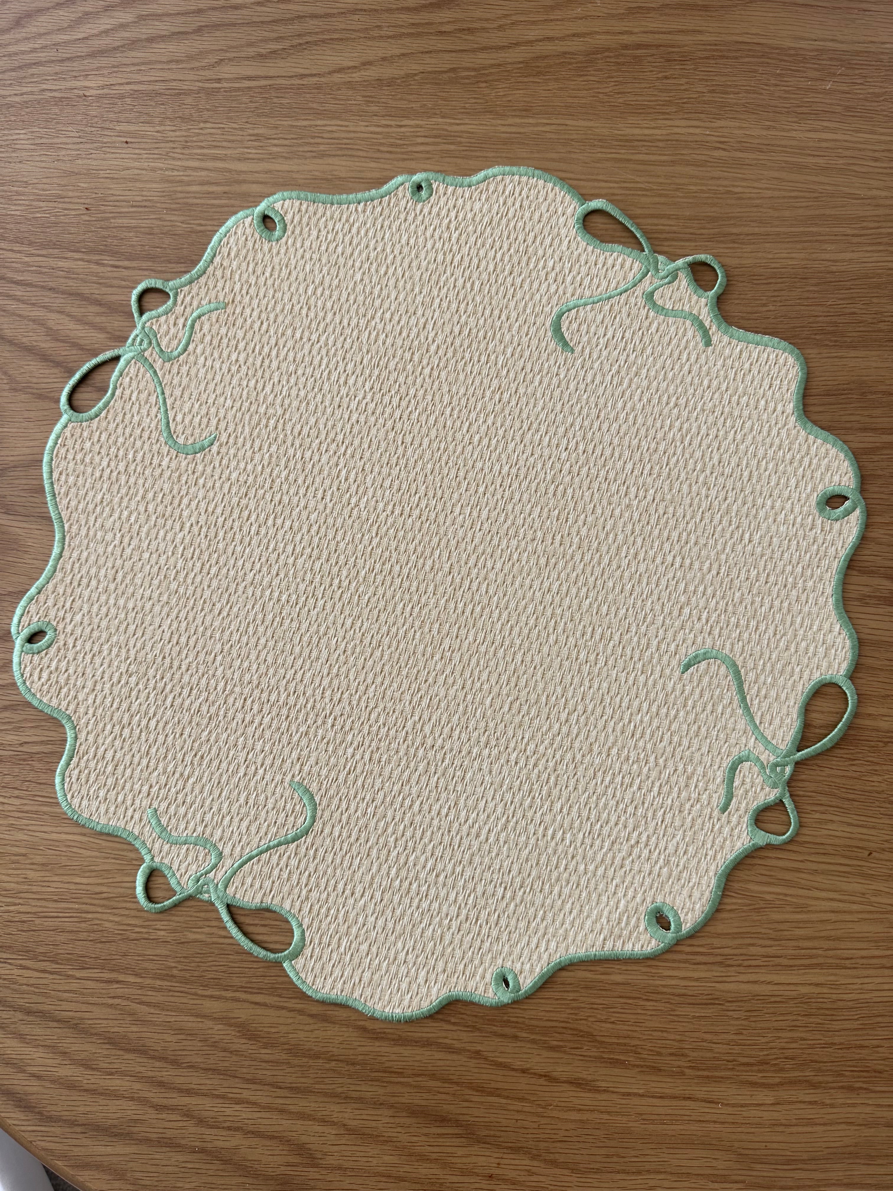 Elegante e cheio de charme, este lugar americano redondo é o toque perfeito para transformar sua mesa posta. Com 42cm de diâmetro, ele é confeccionado em material de alta qualidade e acabamento bordado em laços verdes delicados, que trazem um ar sofisticado e acolhedor à decoração.
