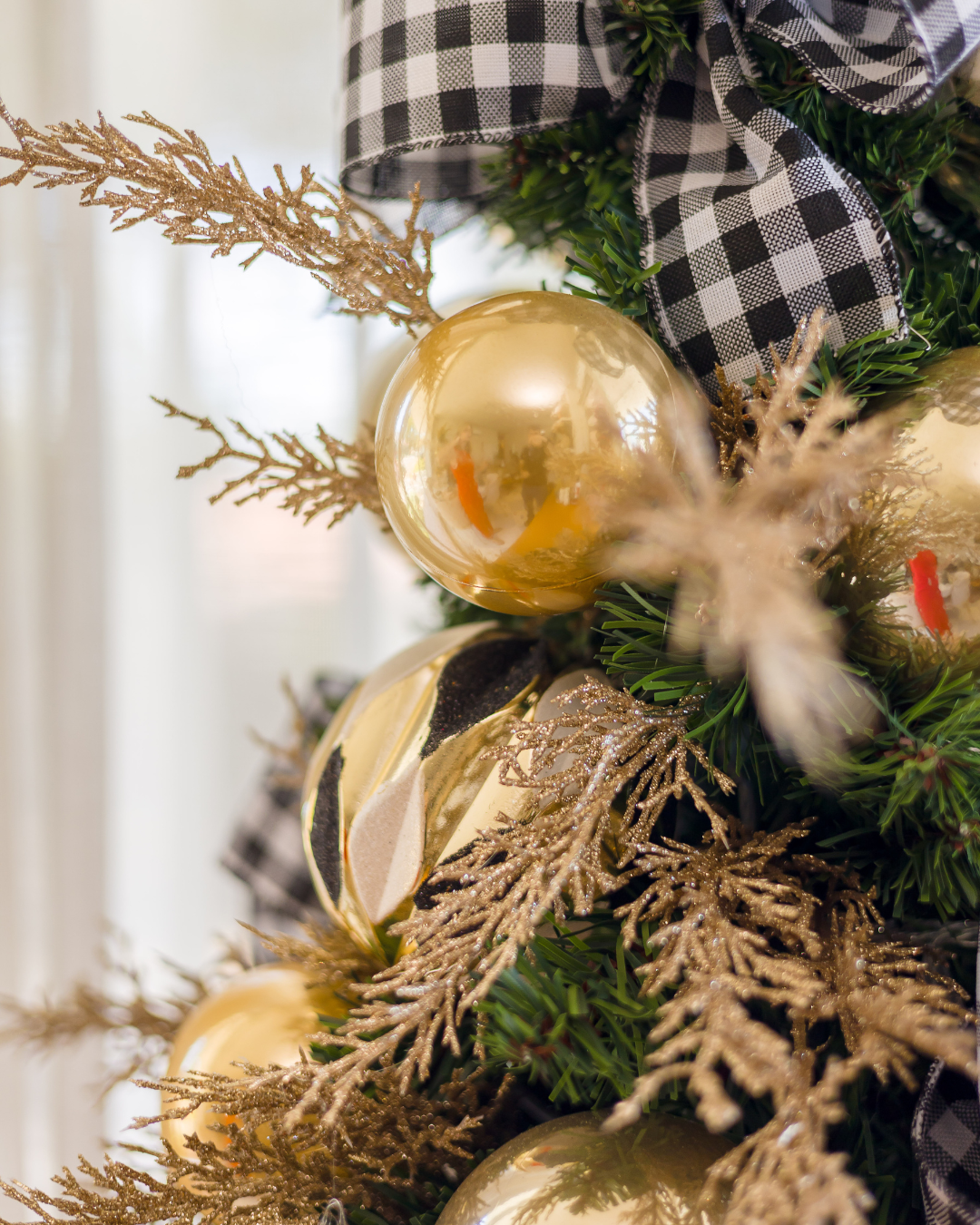 Decorada com laços em padrão xadrez, bolas douradas e folhagens brilhantes