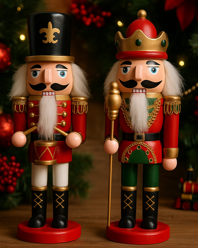 Encante sua decoração natalina com a Dupla Quebra-Nozes Real – Tamboril e Rei. Um conjunto clássico e sofisticado que une duas figuras icônicas do Natal: o soldado tamboril com seu instrumento e o rei coroado com cetro. Juntos, eles trazem charme, tradição e um toque lúdico para sua casa.