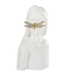Escultura menina em formato de busto na cor branca, com libélula pendurada na face, símbolo de transformação, positividade e boa sorte.