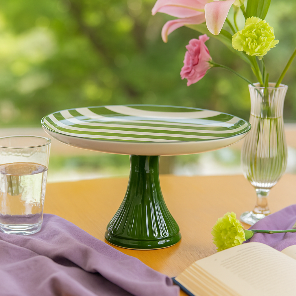 Este sofisticado prato boleira com pé, adornado com listras verdes, é a peça perfeita para destacar suas sobremesas e bolos. Com um design elegante e moderno, ele combina praticidade e estilo, proporcionando uma base estável e charmosa para servir suas delícias. Medindo 27x21cm, é ideal para apresentações de bolos, tortas ou doces em festas e jantares especiais. A combinação de cores neutras com o toque vibrante das listras verdes traz um visual fresco e contemporâneo, enquanto o pé confere um toque de requinte. Feito de material resistente e fácil de limpar, é perfeito para o uso diário ou ocasiões especiais, tornando cada momento mais saboroso e visualmente encantador.