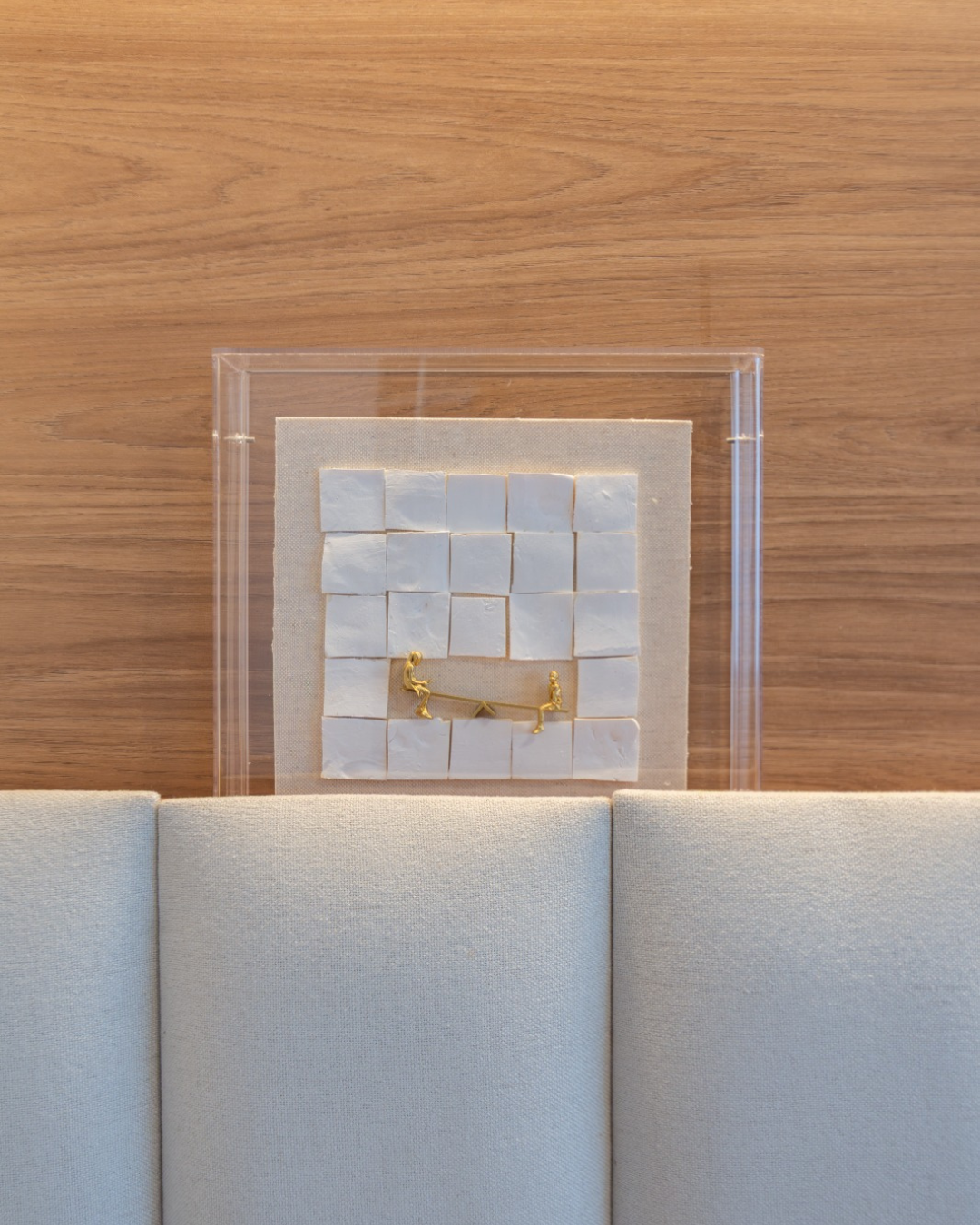 O "Ritmo da Infância" é um quadro em acrílico transparente que emoldura uma cena poética: duas pequenas figuras douradas em uma gangorra, equilibradas sobre um fundo geométrico de fragmentos brancos.