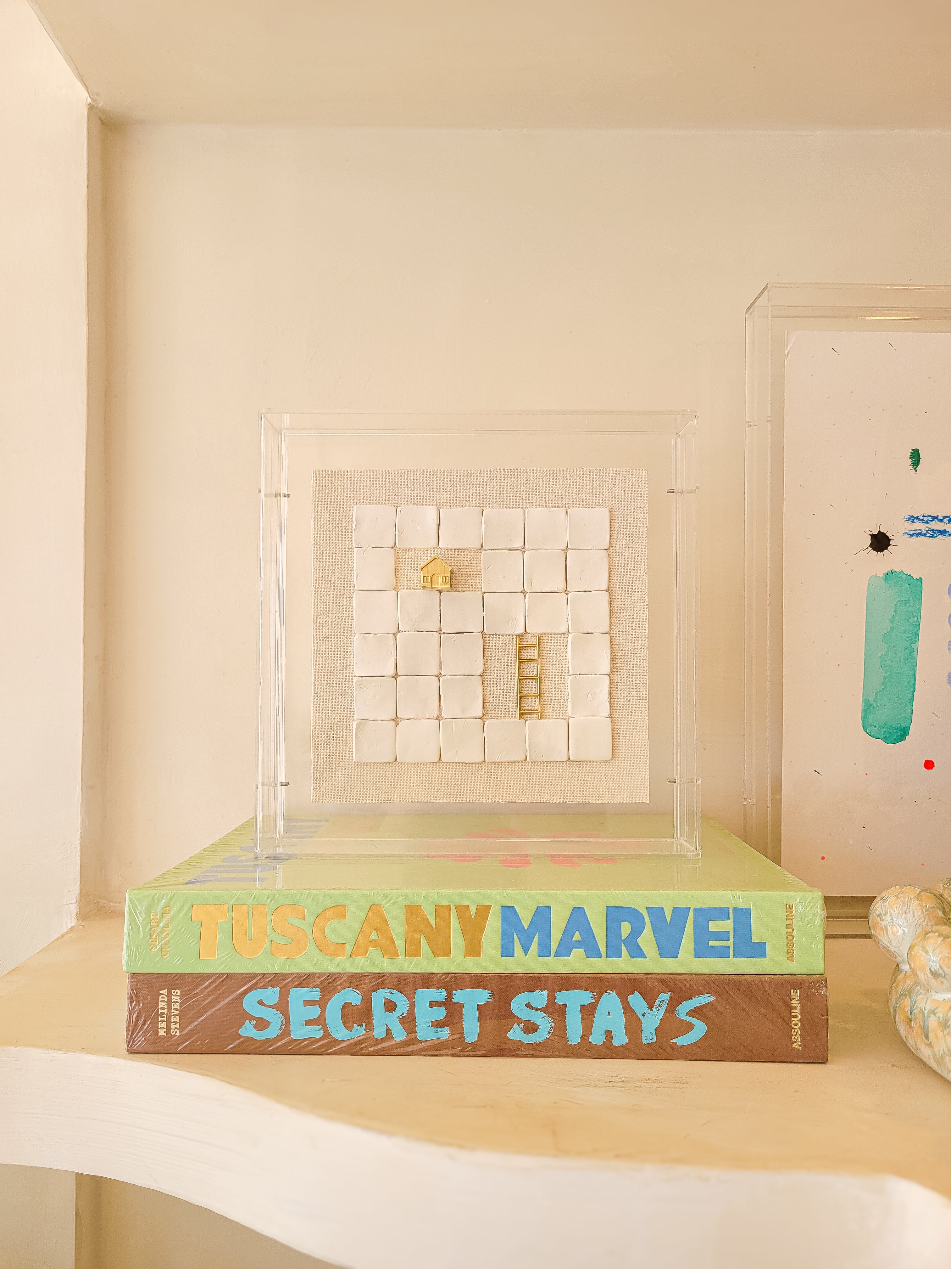 O "Rumo ao Refúgio" é um quadro em acrílico transparente que emoldura uma cena poética: uma pequena escada dourada conduz até uma casa suspensa, repousando sobre um fundo geométrico de fragmentos brancos.