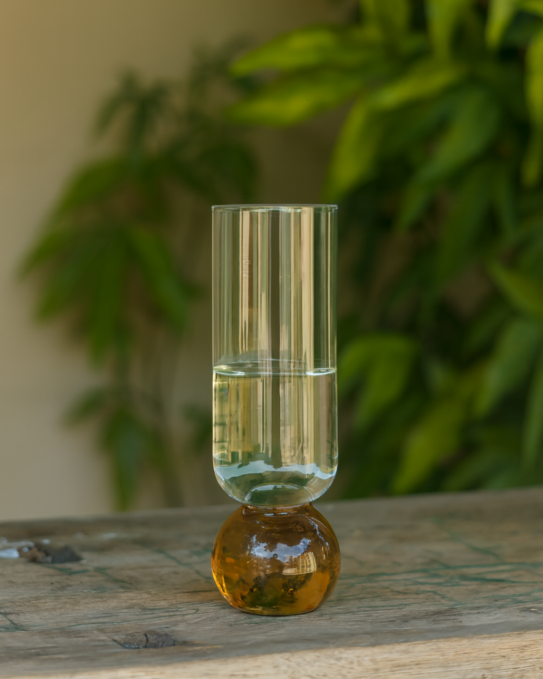 Elegância e modernidade se encontram nesta taça exclusiva. Com design contemporâneo, seu corpo cilíndrico em vidro transparente é sustentado por uma base em vidro âmbar em formato de esfera, que adiciona charme e sofisticação à peça.