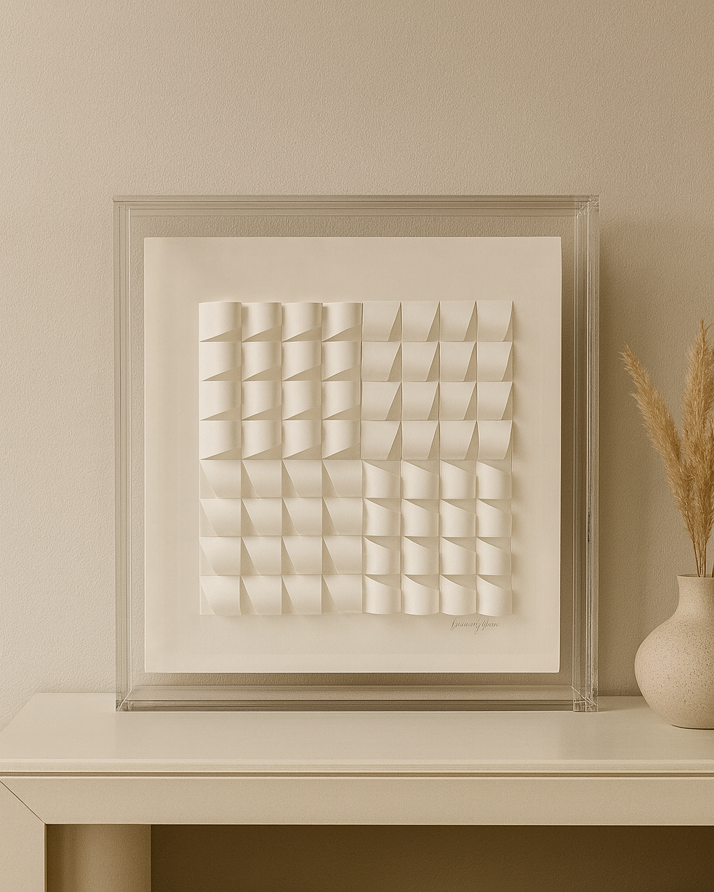 Este quadro em acrílico traz uma composição artística tridimensional que combina movimento, luz e sombra. O trabalho em papel, disposto em módulos geométricos dobrados, cria um efeito visual dinâmico que se transforma conforme o ângulo de observação. Uma peça sofisticada e minimalista, ideal para quem valoriza design contemporâneo e arte conceitual.