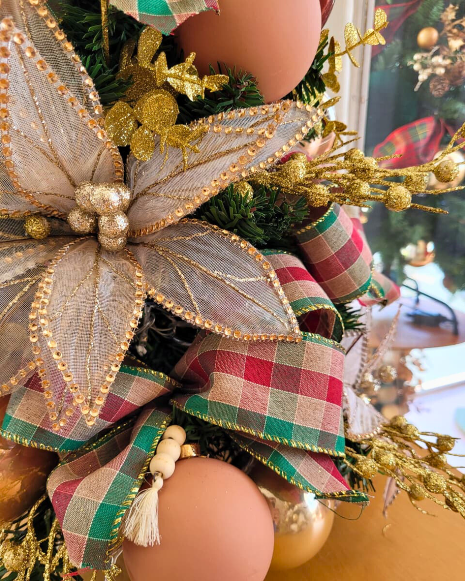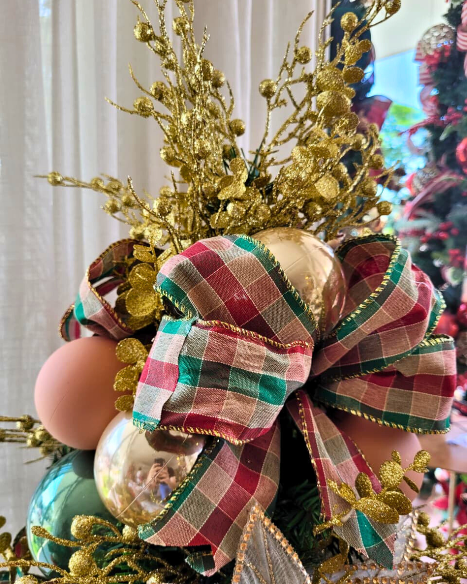 Os laços em tecido xadrez, as flores douradas e as bolas com acabamento fosco e brilhante criam uma composição rica e acolhedora, perfeita para celebrar o Natal com estilo e elegância. O toque de ramos dourados adiciona movimento e luminosidade, transformando o ambiente em um verdadeiro cenário festivo.