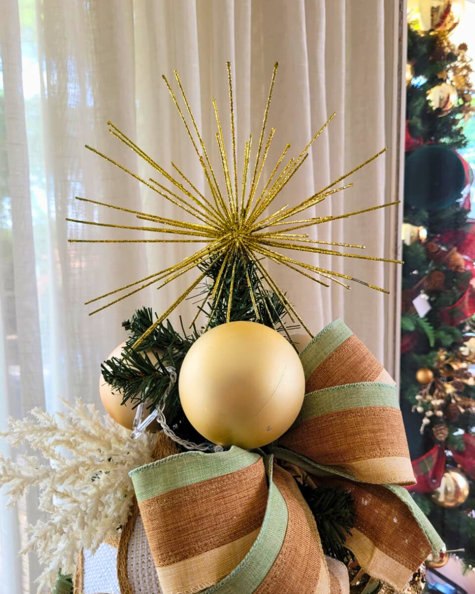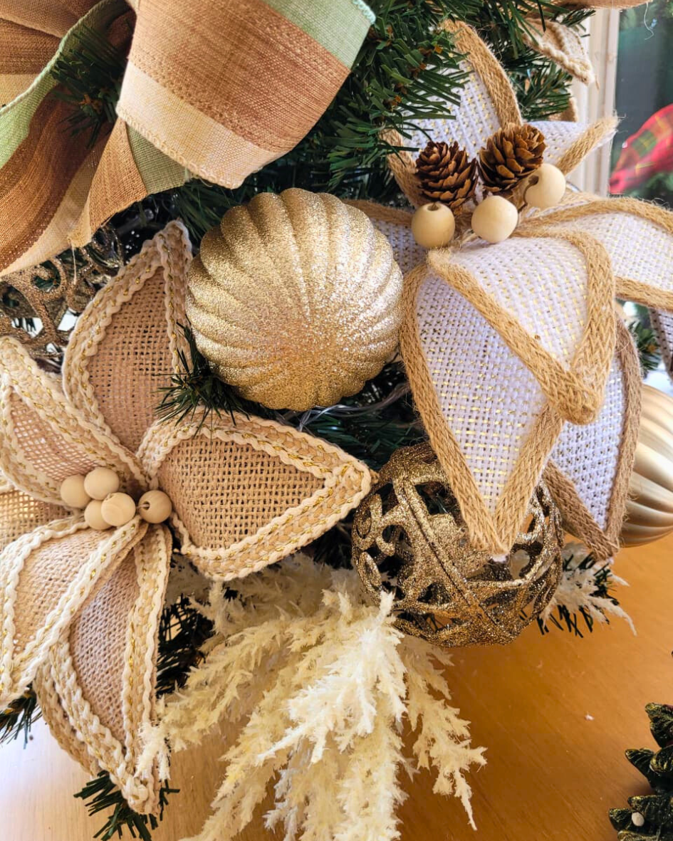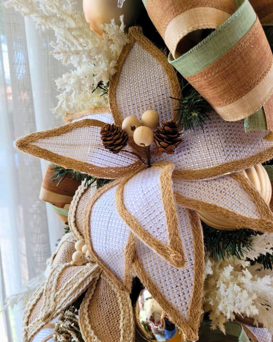 Decorada com laços em tecido rústico, flores delicadas, bolas douradas e elementos em off-white, ela traz leveza e brilho na medida certa. O topo é finalizado com um adorno dourado elegante, que completa a composição com um toque de glamour discreto.
