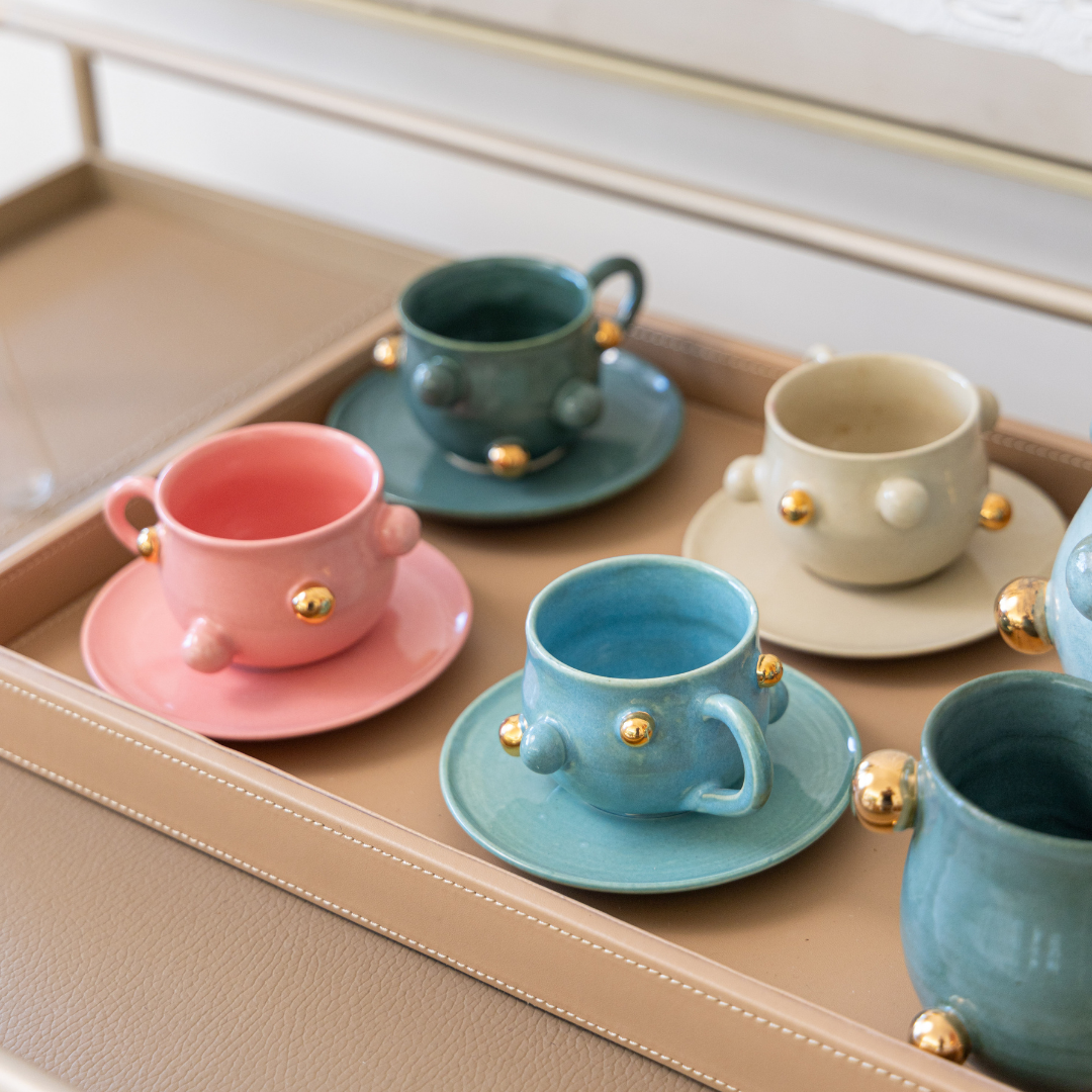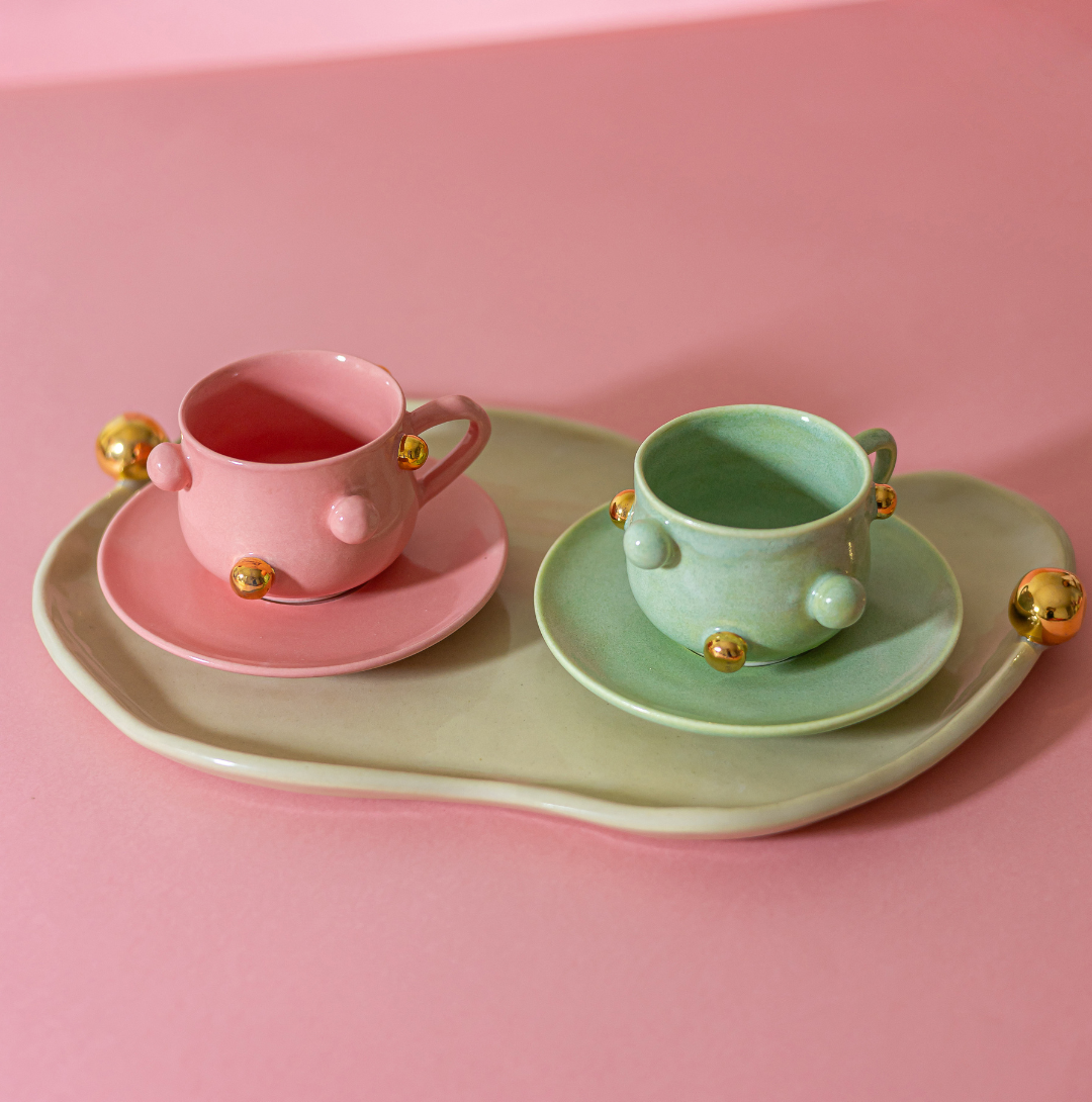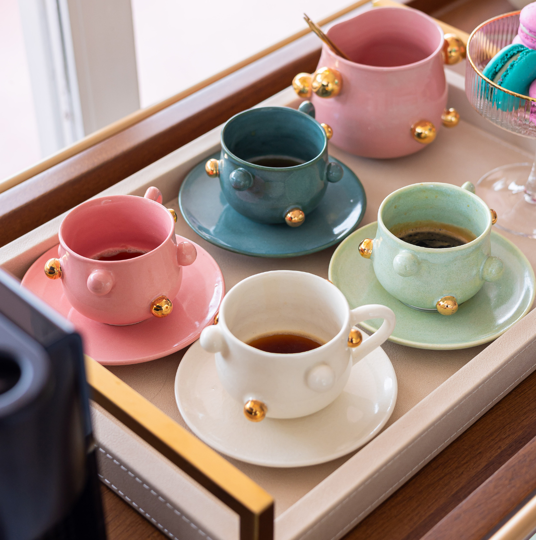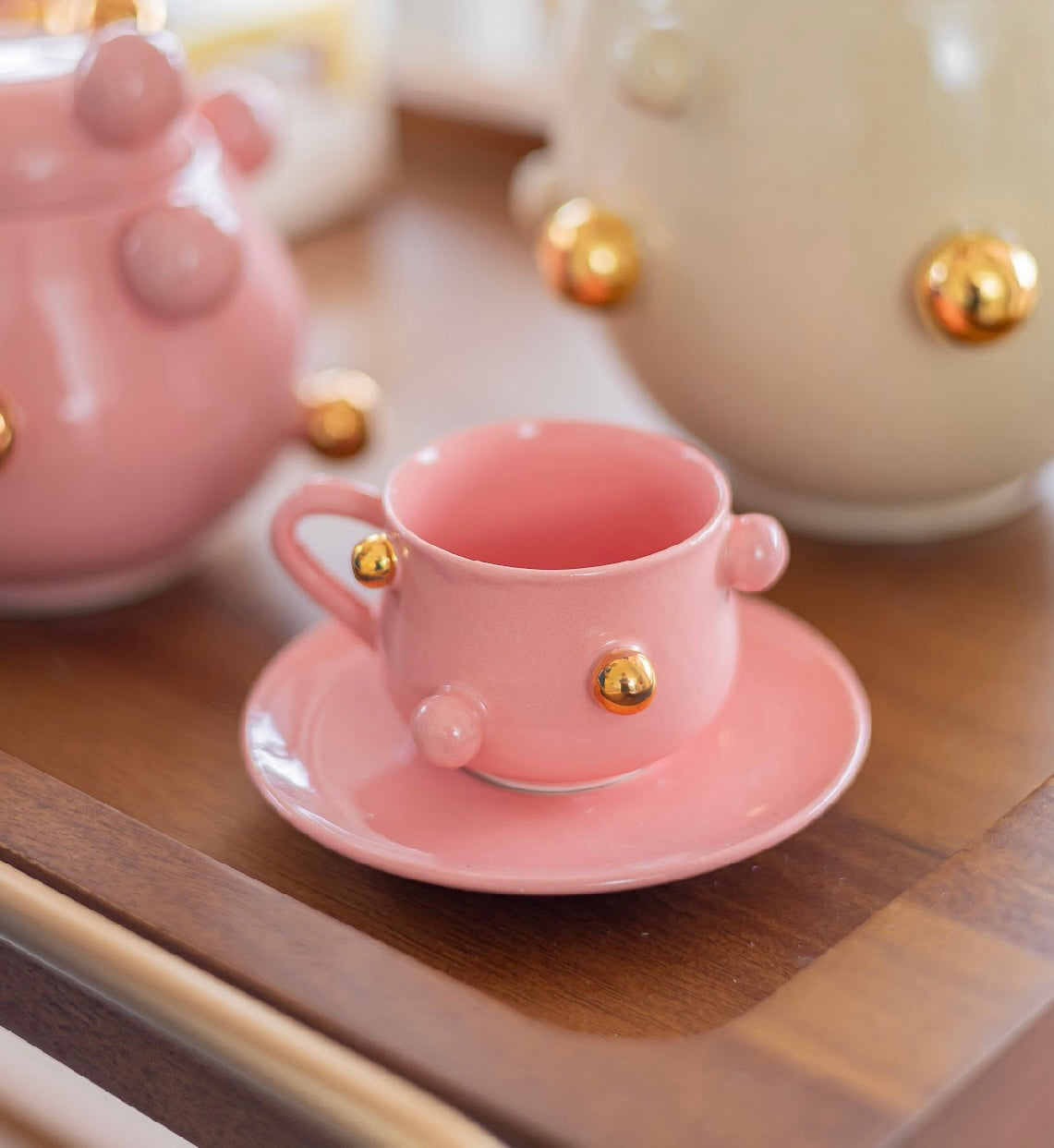 Elegância Subtil: A cor rosa trás um charme à xícara e ao pires, criando uma base perfeita para os detalhes em ouro que adicionam um toque de glamour discreto.